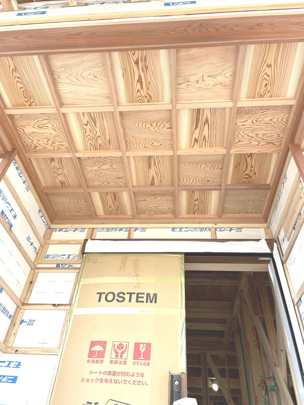 玄関前の軒天上は無垢板による格子の意匠。和風建築の技術が活かされ、落ち着きがありつつ個性的なデザインに仕上がっています。毎日のお出かけ時、帰宅時に自然と目に入る軒天井が心を癒してくれますね。